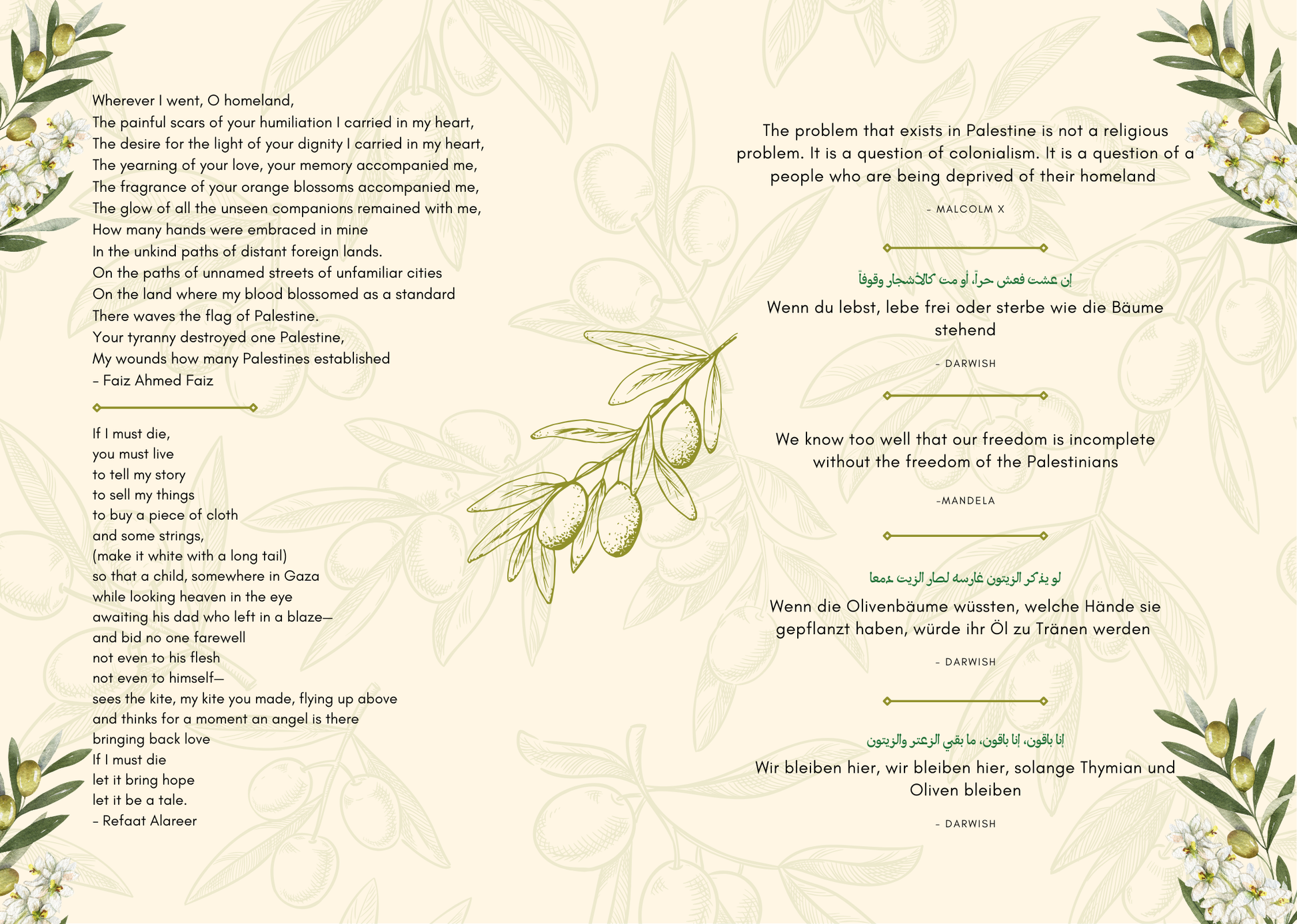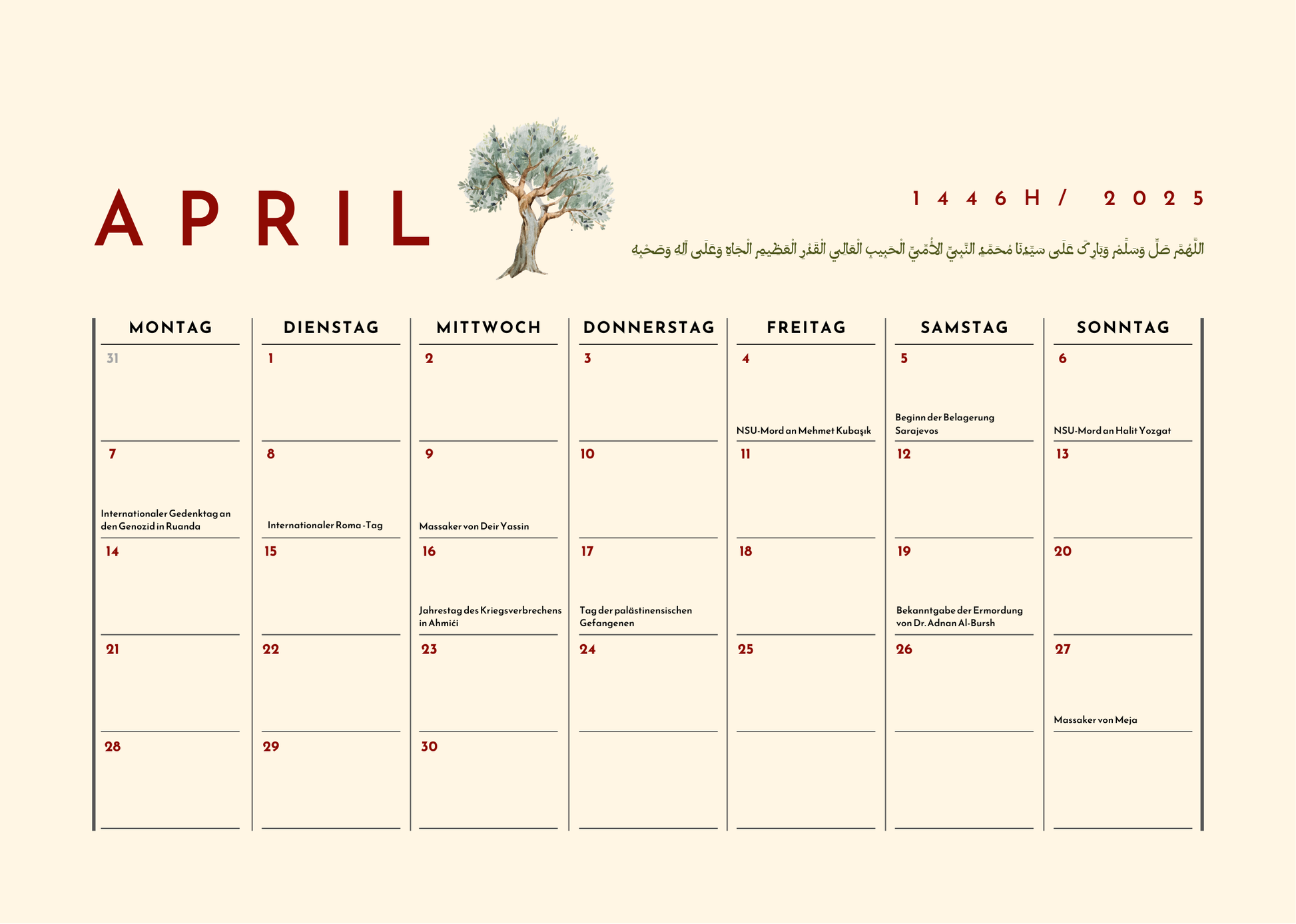 Entdecken Sie den Palästina Kalender 2025, der in einzigartiger Weise die Geschichte, Heiligkeit und aktuellen Geschehnisse rund um Palästina in den Fokus rückt. Jeder Monat bietet facettenreiche Einblicke, die die Bedeutung Palästinas, insbesondere von Gaza, in unserem Alltag hervorheben.